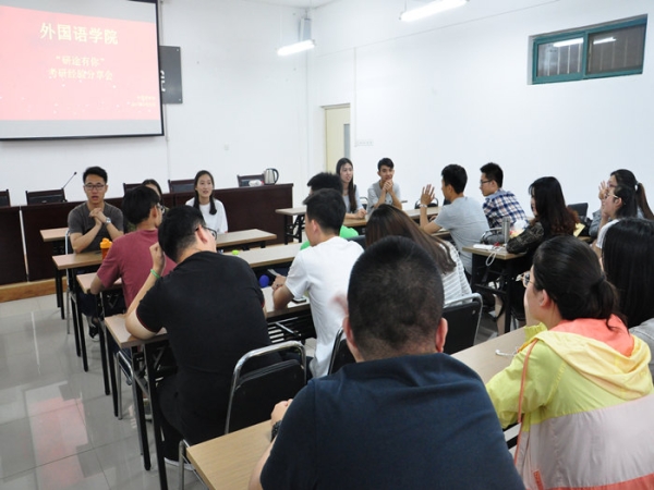 为贯彻落实齐鲁工业大学“1236攀登计划”,帮助学生及早确定考研目标,提高学生考研积极性,准确把握考研形势,5月22日下午,由学生工作处主办,外国语学院承办的“研途有你”考研经验分享会在文科楼522召开。本次会议邀请了2017届优秀毕业生来静,赵春晓等5名同学进行经验交流,外国语学院学工人员及具有考研意向的2014级50余名同学参加了此次分享会。