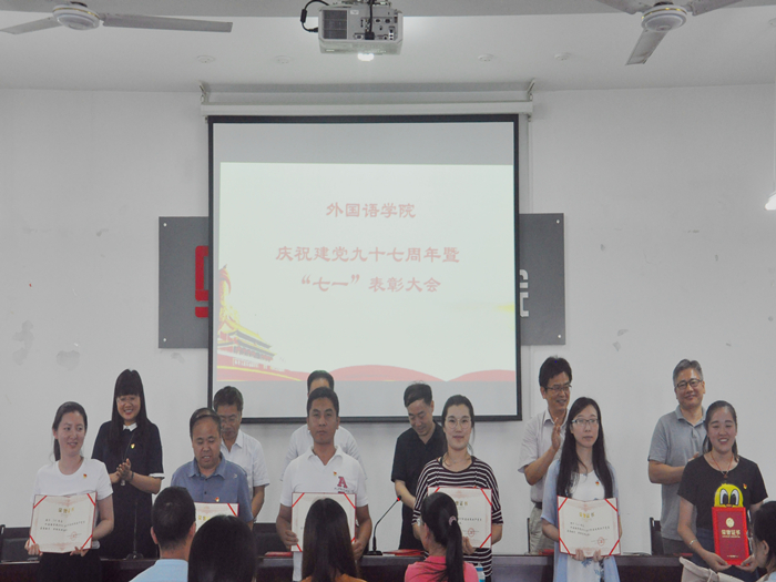 6月28日下午,在中国共产党成立97周年之际,外国语学院在文科楼522举办庆祝建党九十七周年暨“七一”表彰大会。学院党政领导、全体党员以及入党积极分子代表参加本次表彰会,大会由学院党委副书记齐艳主持。