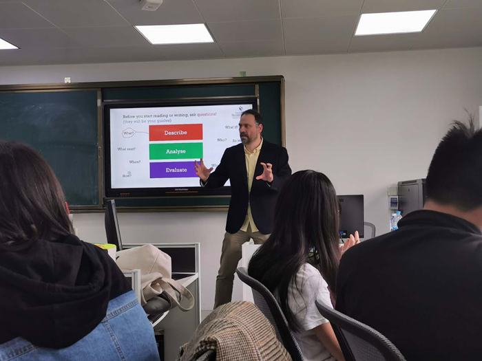 讲座伊始, Attila博士与研究生同学们一同进行了单词拼写游戏。随后,他结合英语教学法中的普利茅斯模型,从“Describe”, “Analyse”, “Evaluate”等三个方面带领大家学习了如何构建论文框架以及如何在论文写作过程中发现问题与解决问题。最后,Attila博士要求研究生同学们应在日常学习过程中随时保持批判精神,遇到问题要勤思考、多提问,并能从各个角度寻找解决问题的方法。